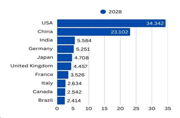 According to the World Economic Outlook of the IMF released in April 2024, India has surpassed Japan in the size of GDP and surpass Germany in 2028 with a GDP size of USD 5584 as compared with the size of Germany at USD 5251 billion in 2028. India will be the third largest economy in 2028 with a size of more than USD 5 trillion